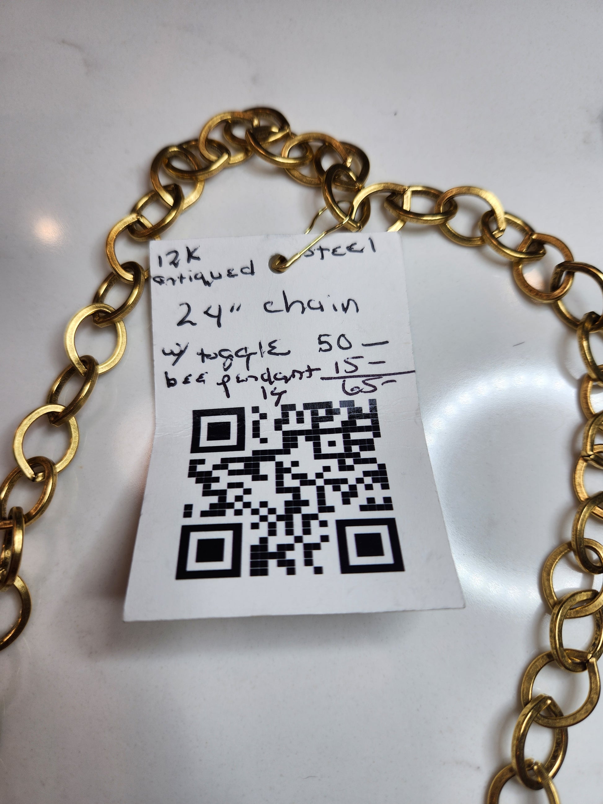 This 24" oval link toggle necklace falls at the top of the bust line. The chain, toggle and pendant are made of antiqued 12K gold over stainless steel.