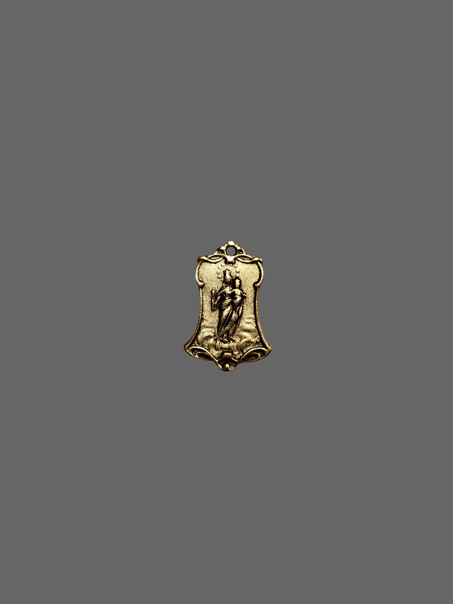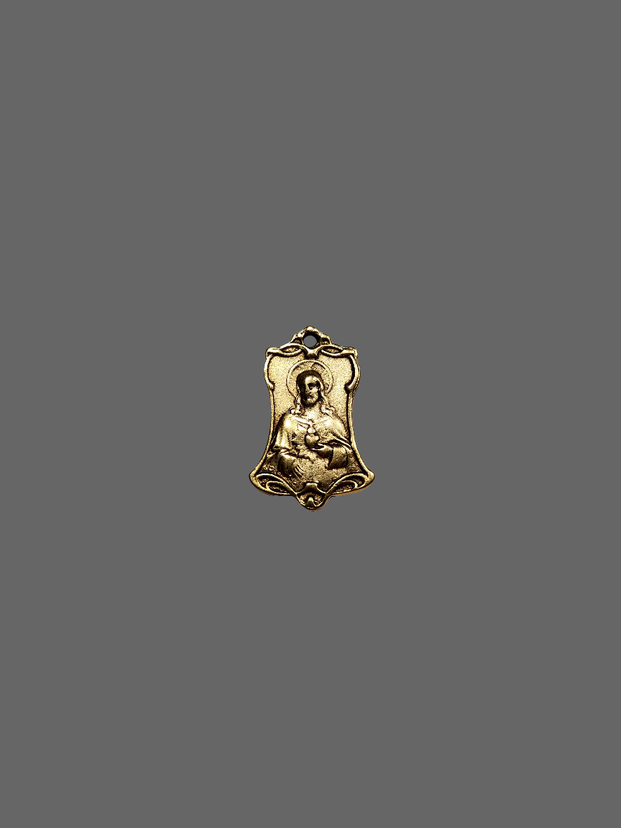 This beautiful, uniquely shaped, two-sided pendant features The Virgin Mary holding the Christ child on the front and The Sacred Heart of Jesus image on the back. It is pewter with gold overlay.