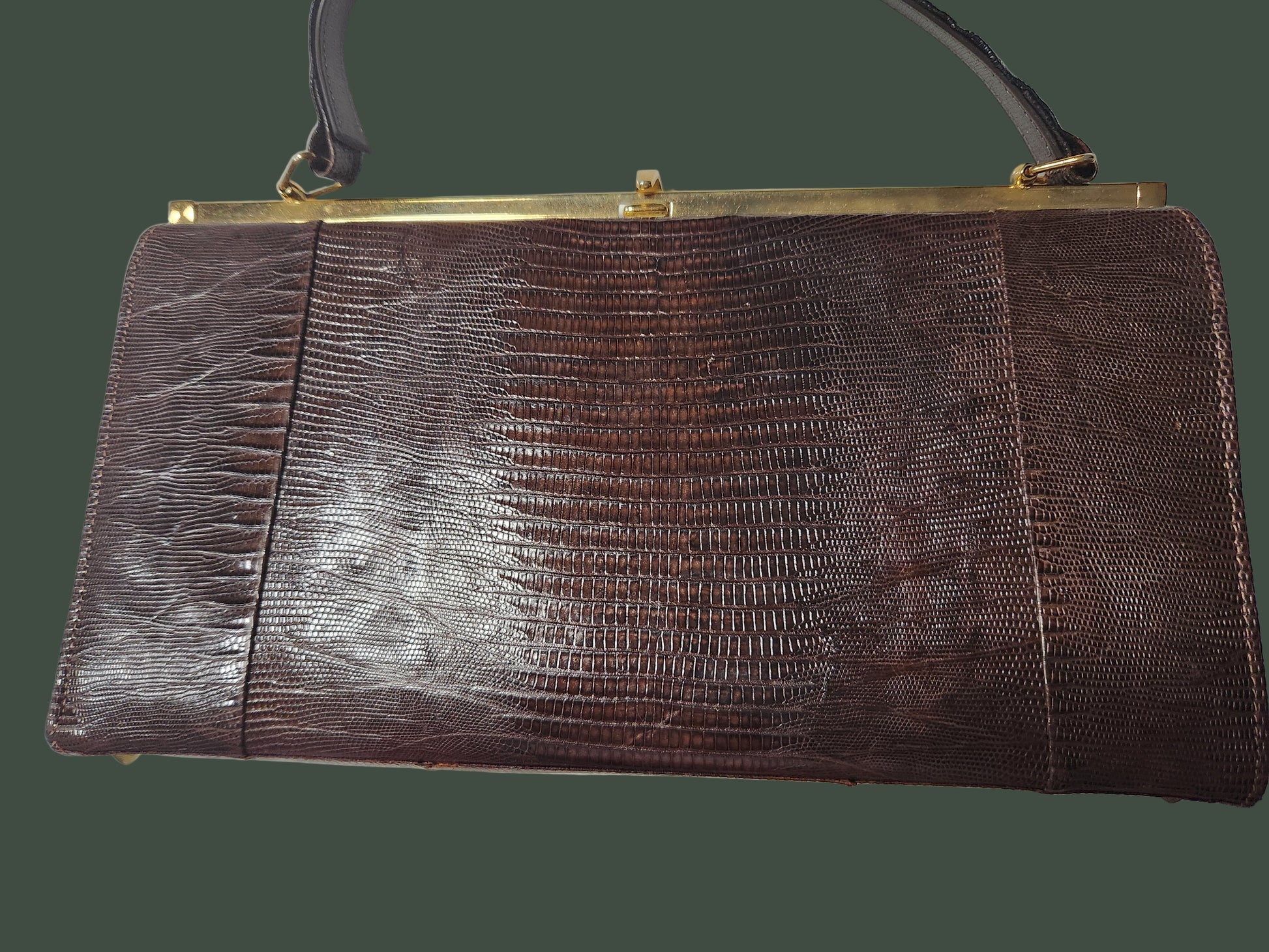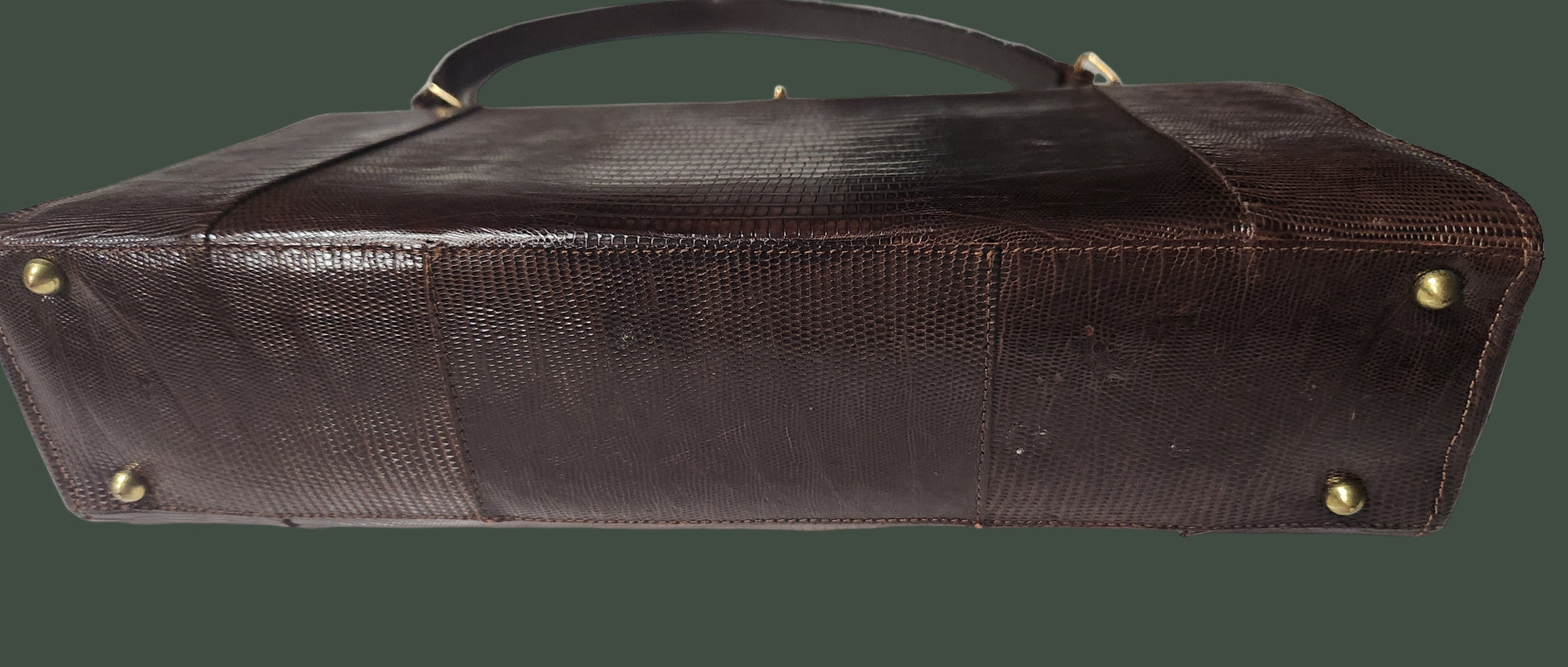 This beautiful vintage bag in rich brown displays the Brahmin mark on the inside frame. It has a lizard leather outer and a high-grade vinyl interior. It would add a touch of class to your outfit. It is in excellent condition and comes with its original rectangular mirror. The handle drop is 4".