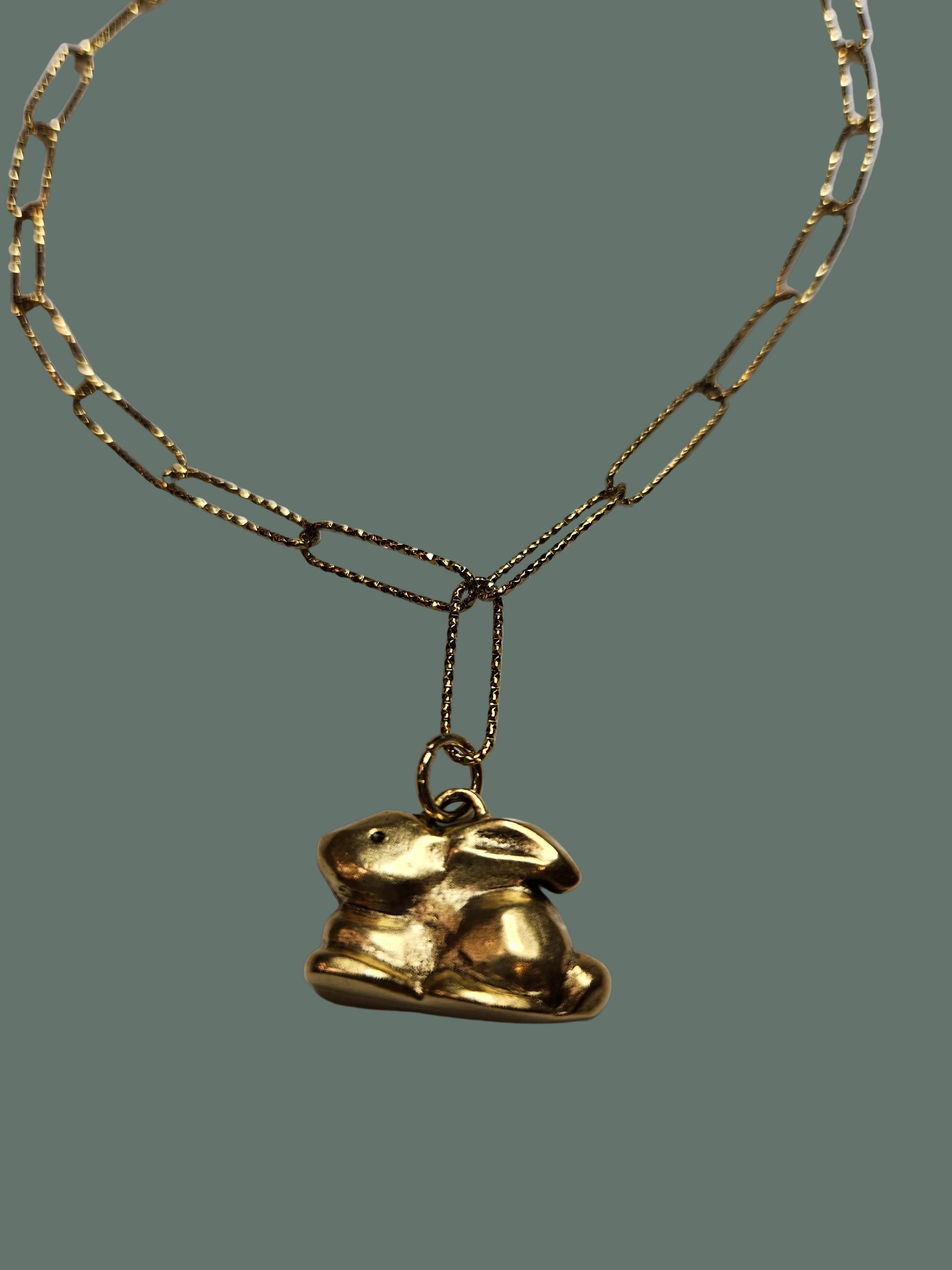 This 16-18" long eared rabbit pendant necklace is made of 18K gold over stainless steel and 12K gold plated high-quality pewter.