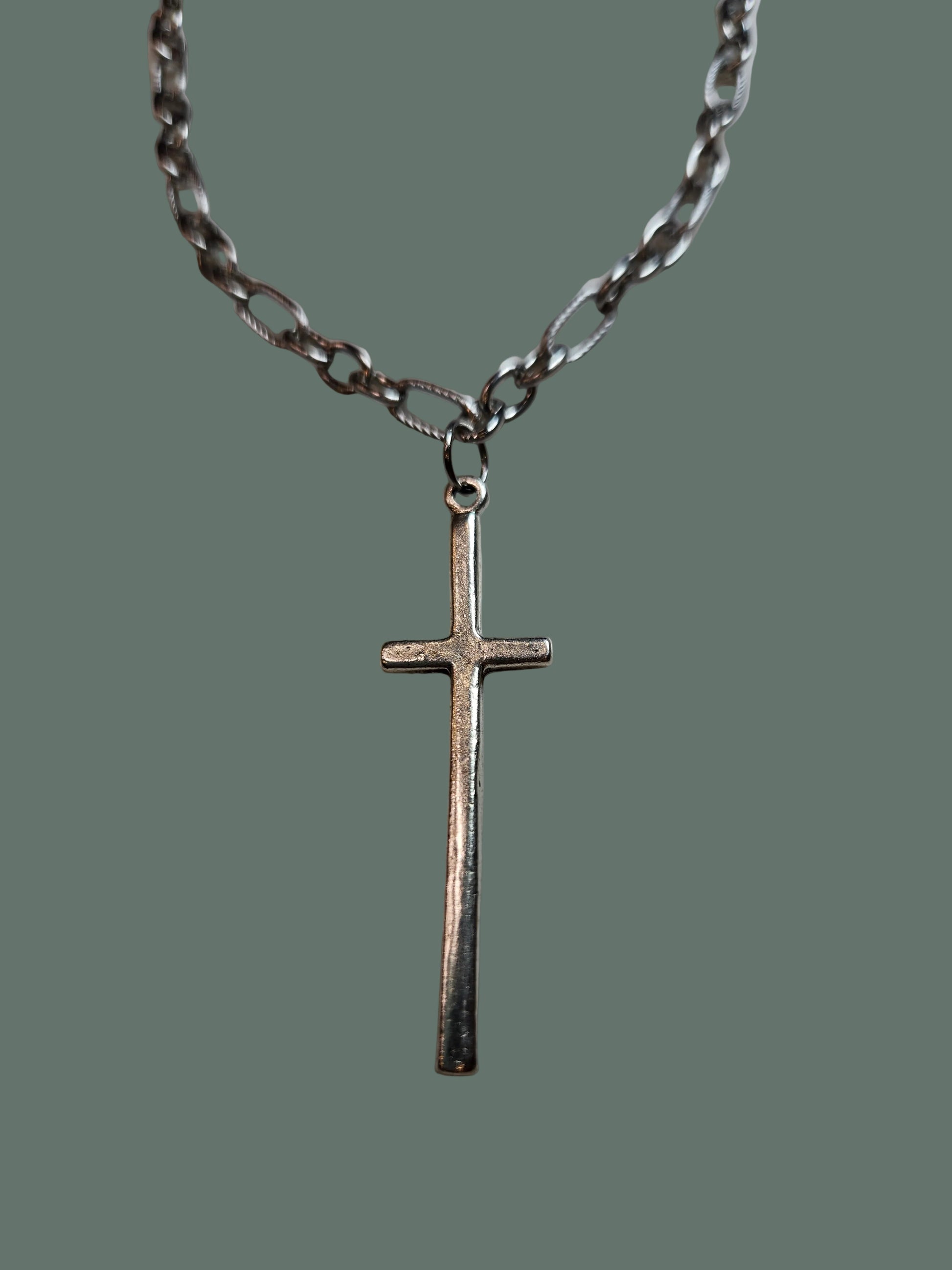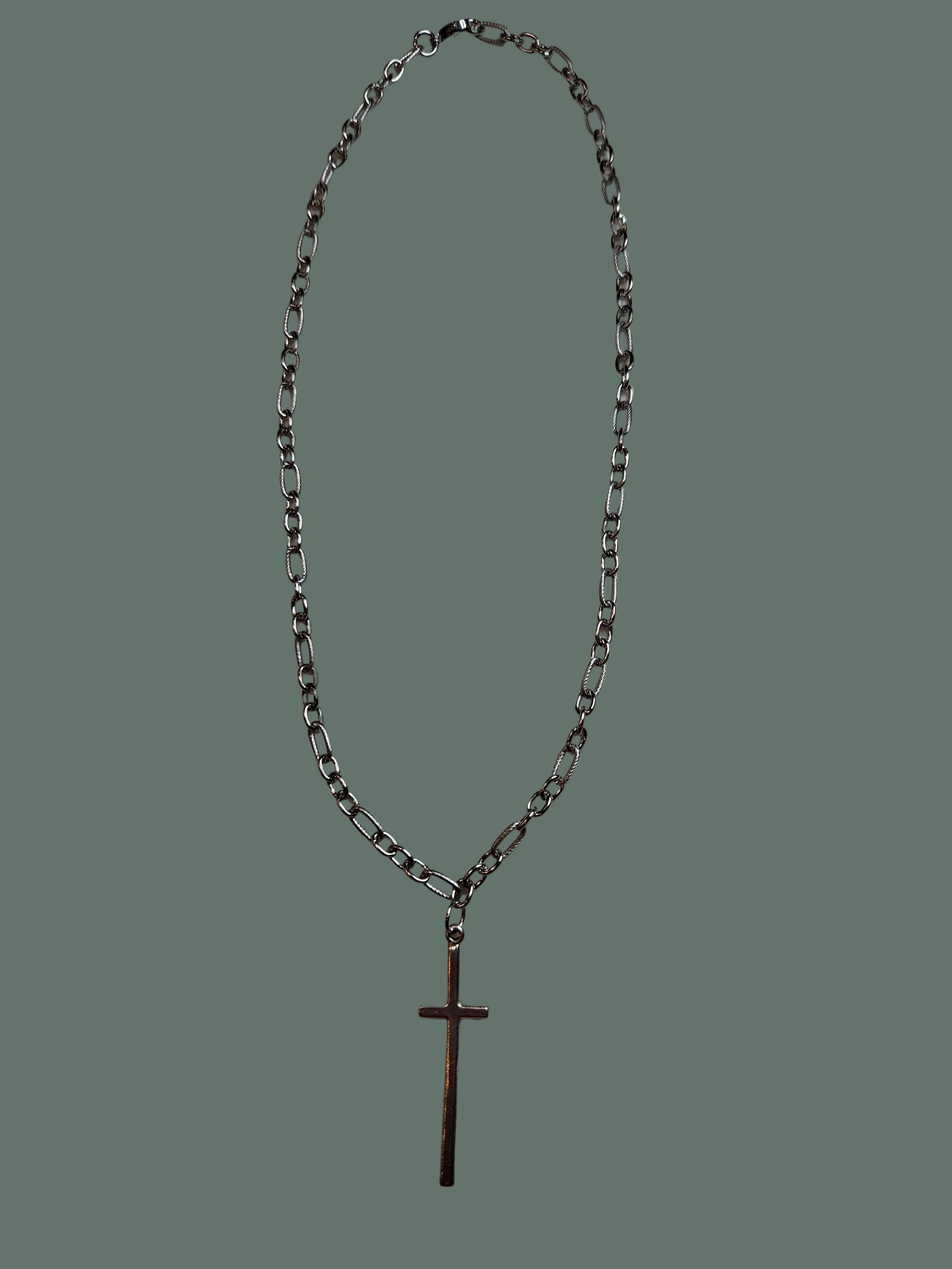 This 20" alternating link necklace is made of Surgical grade stainless steel. The long skinny cross pendant is made of high-quality quality pewter.
