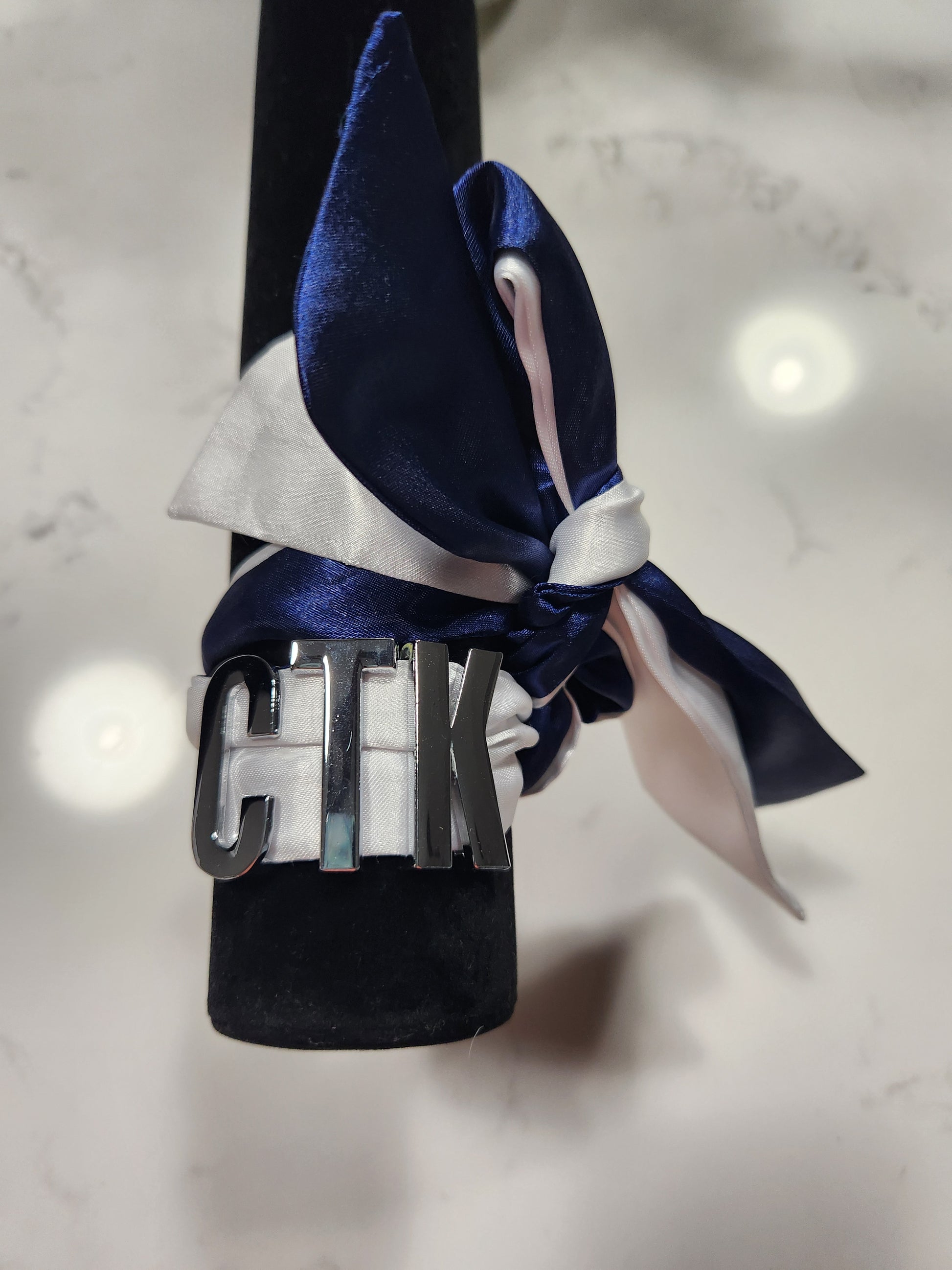 Go Saints! This letter set with a white and navy scarf can be styled as a scarf bracelet, hat band, choker or purse scarf. Celebrate Christ the King!
