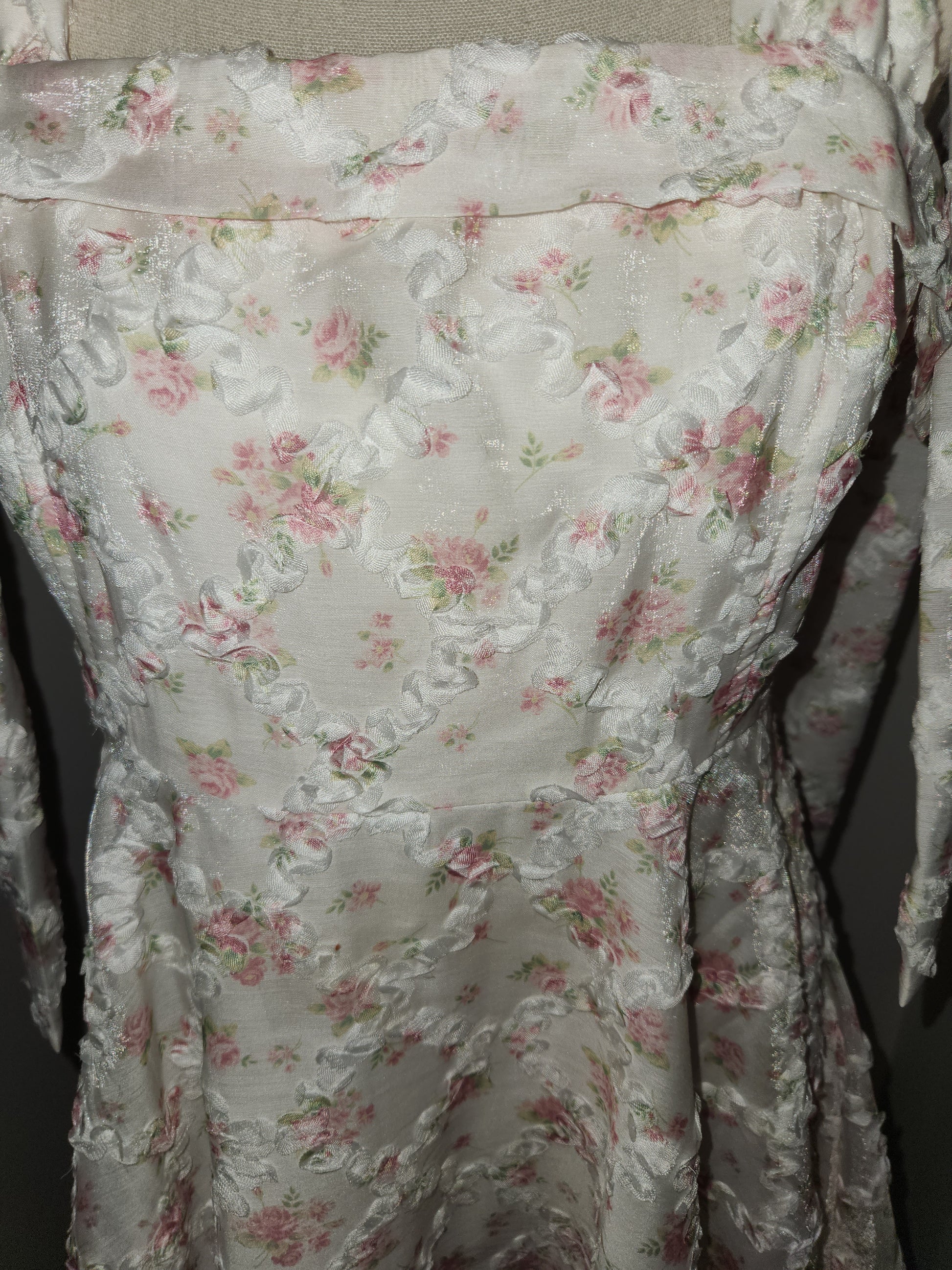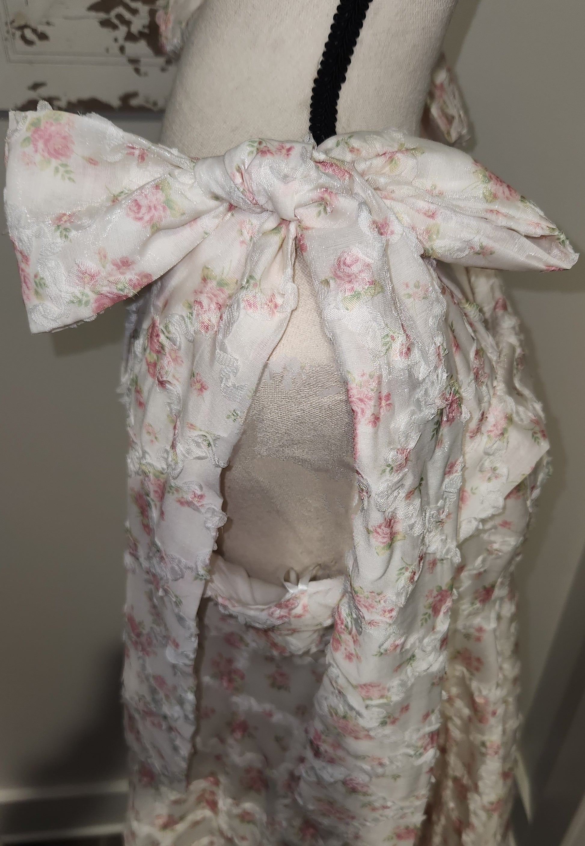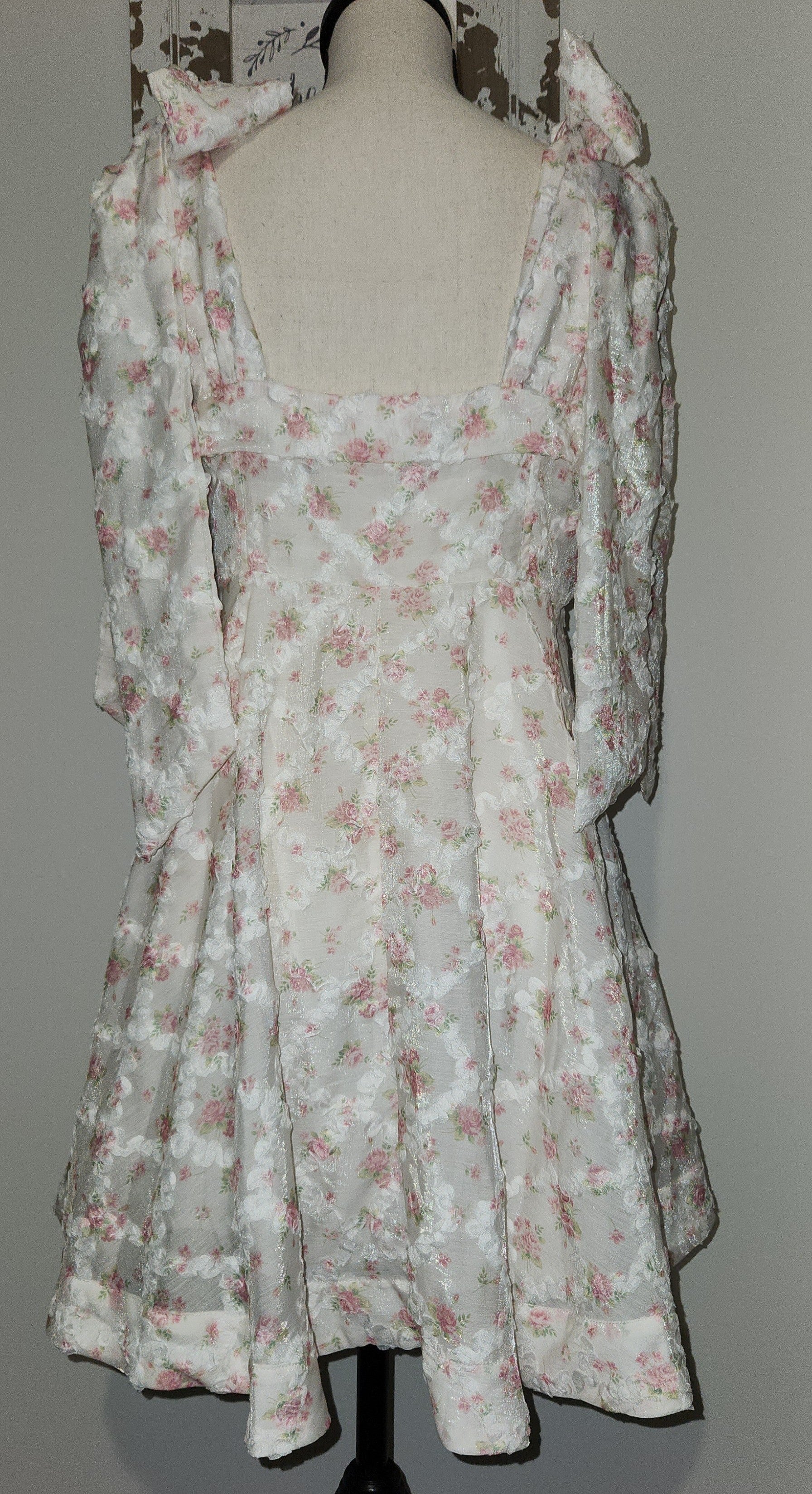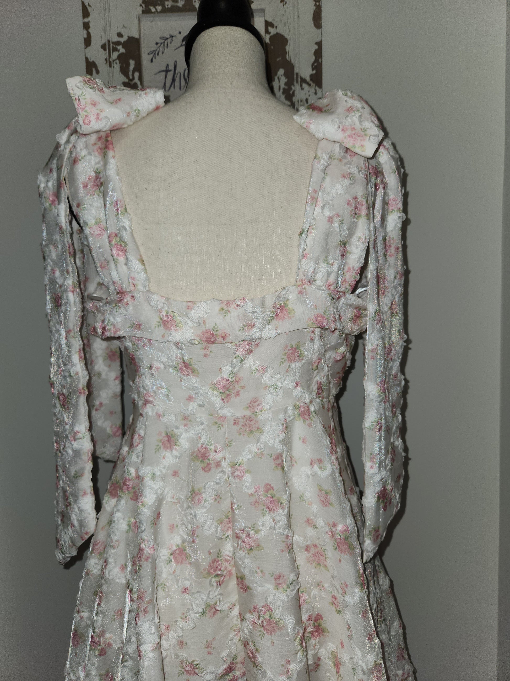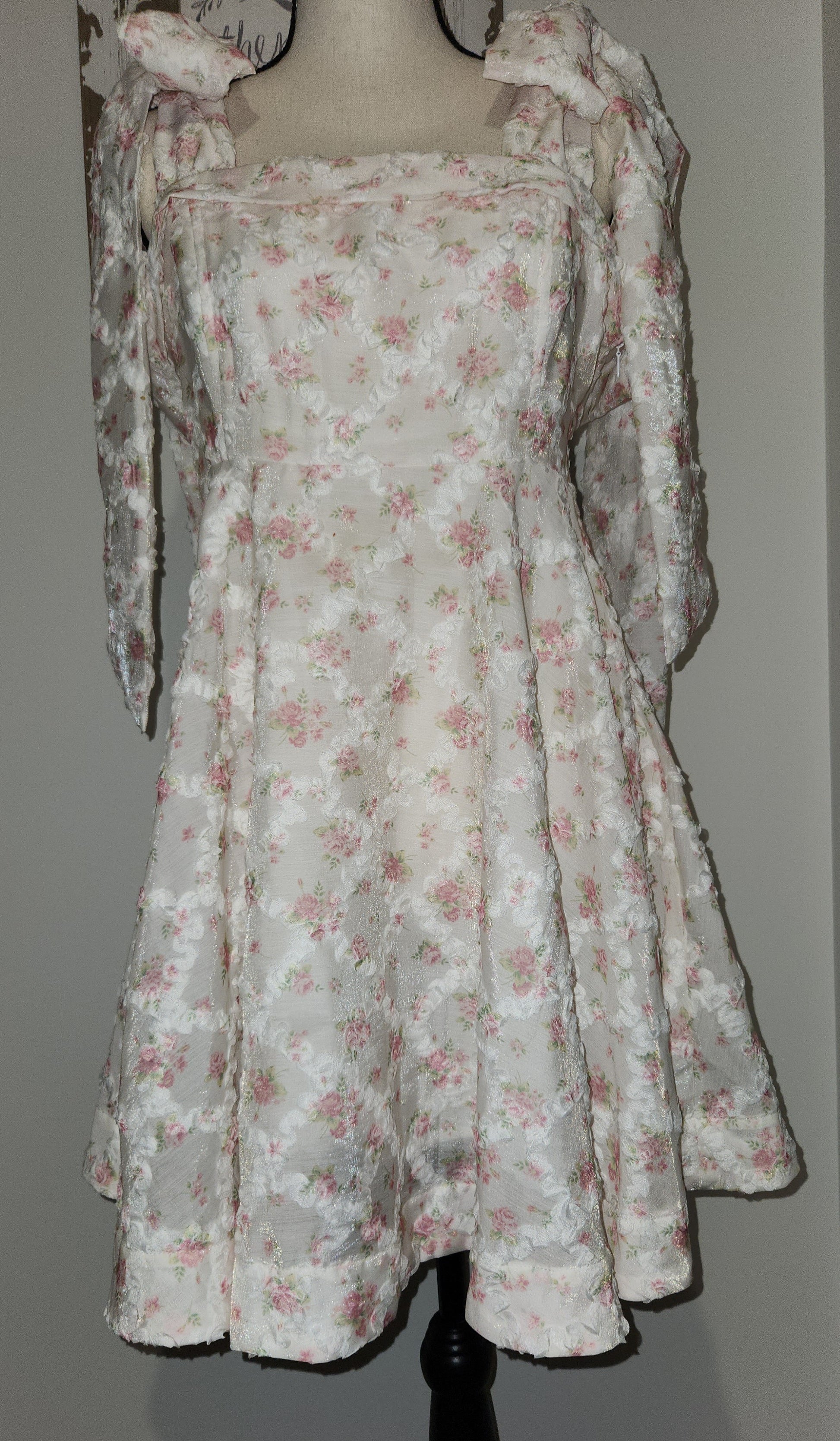 This elegant sleeveless dress features a delicate pink and white pattern. It has a beautiful texture woven around the floral pattern. The shoulder ties add visual interest and beauty!