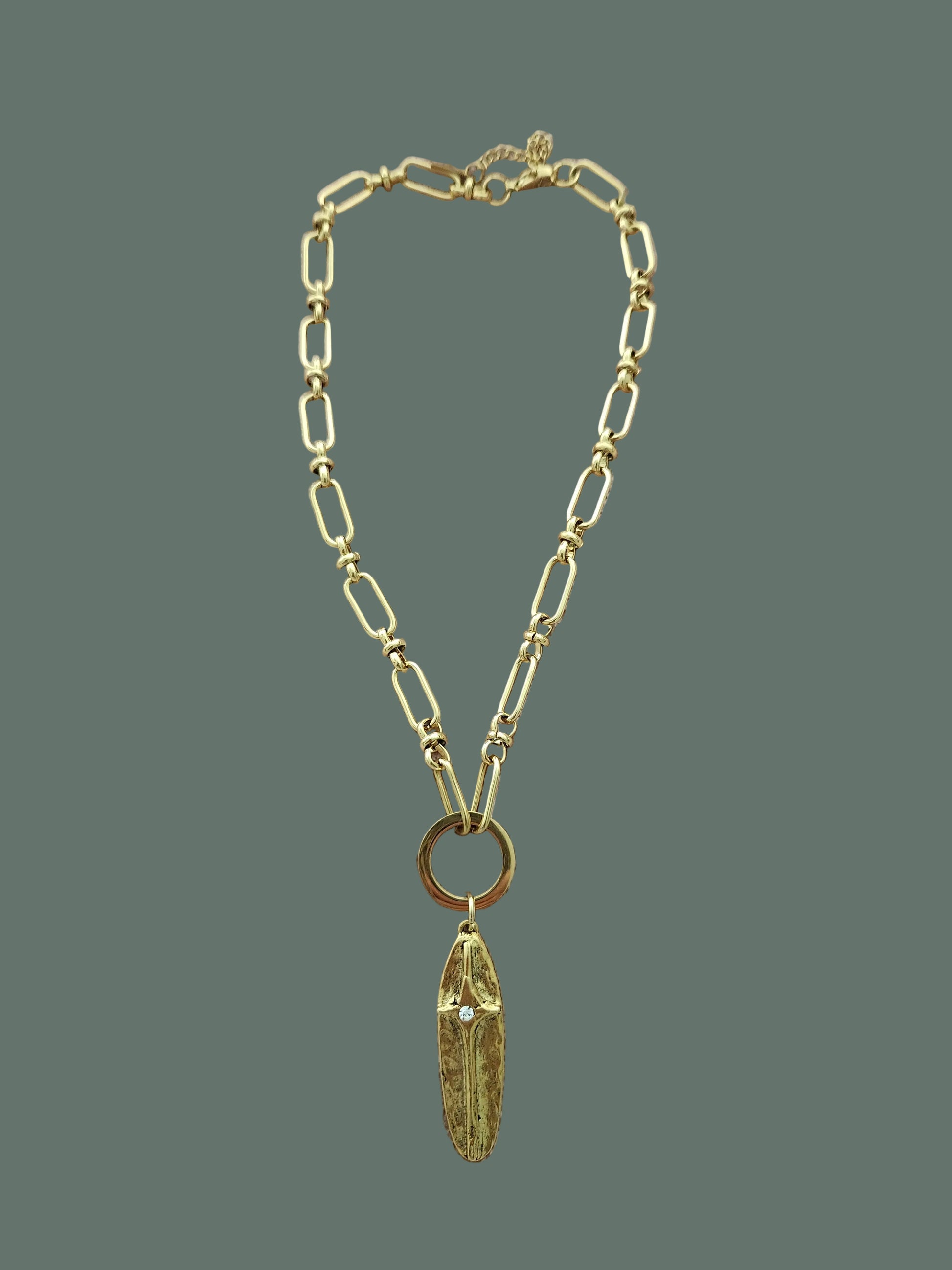This18-20" elongated link chain necklace is by DSO. The elongated oval cross pendant has a rhinestone where Christ's head would be on the cross. The chain is 18k gold over stainless steel. The pendant is 12K gold over high-quality pewter.