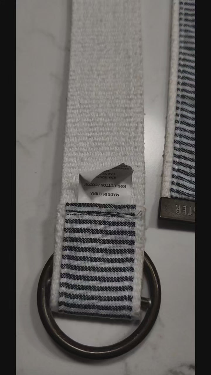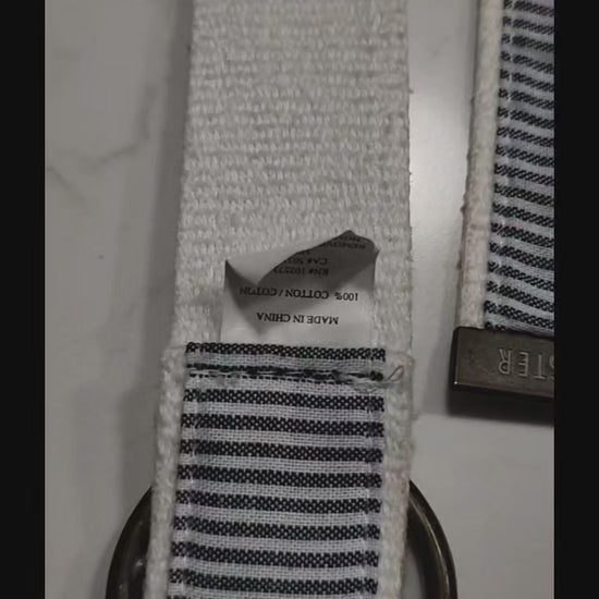 Classic Navy and White Pinstripe with Hollister Seagull 37" long. Elevate your style with the Hollister Canvas Belt! This blue and white pinstriped belt, measuring 37 inches, adds a touch of chic to any outfit. Its durable canvas material ensures a long-lasting accessory, perfect for any occasion. Pair it with your favorite jeans or dress it up for a sleek and sophisticated look.
