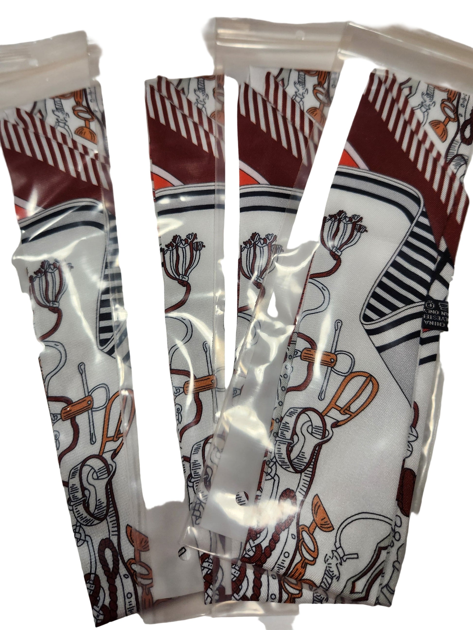 Ivory, a pop of orange, brown and maroon skinny scarf with riding tac theme. Rich colors!