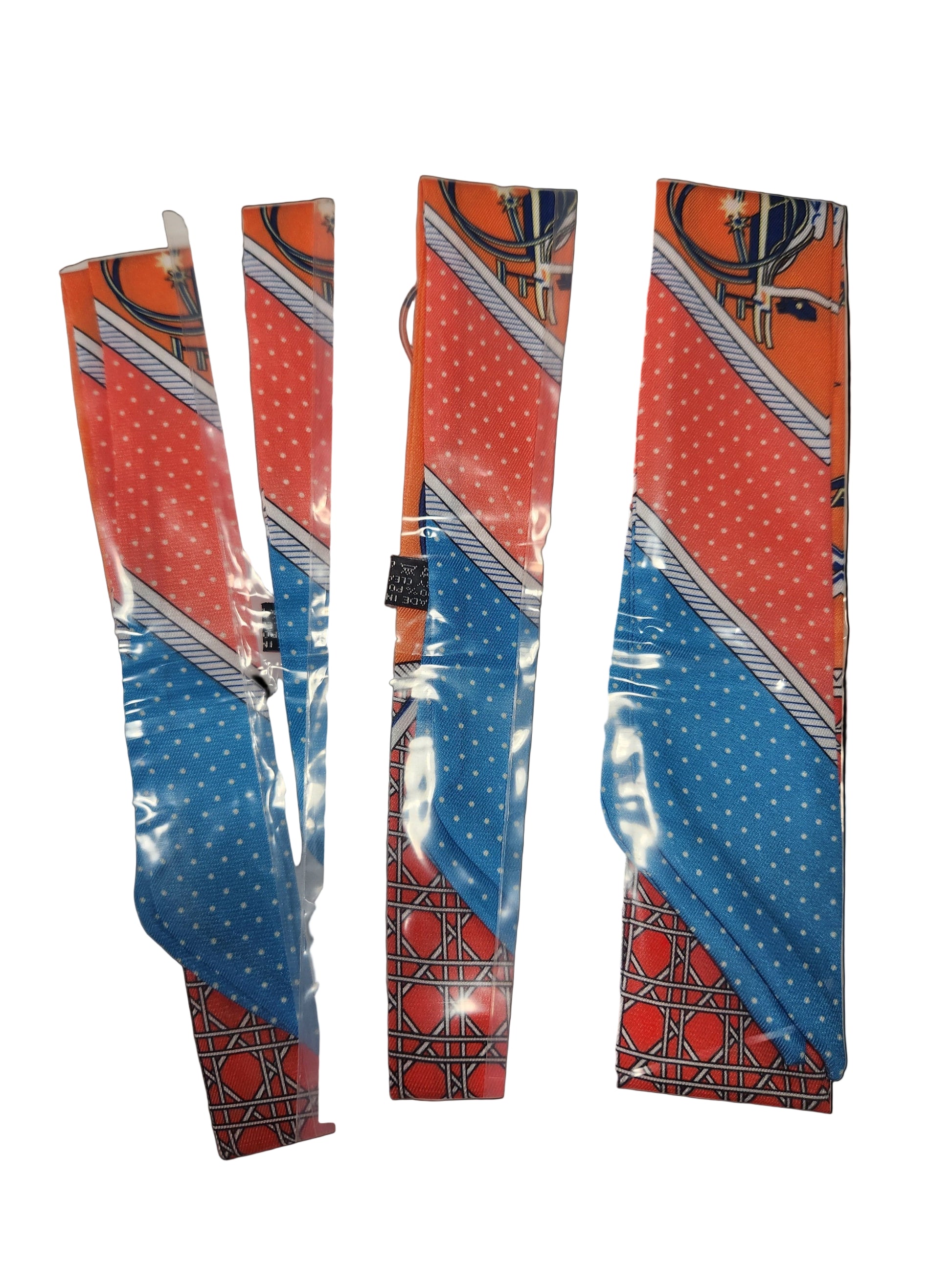 This polyester orange, blue and cream scarf would work well as a charm necklace, bracelet or bag scarf with a tiger and a football for Auburn University.