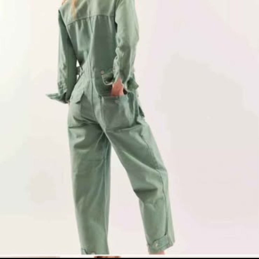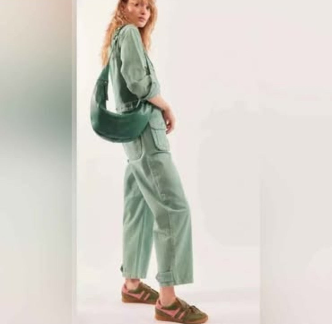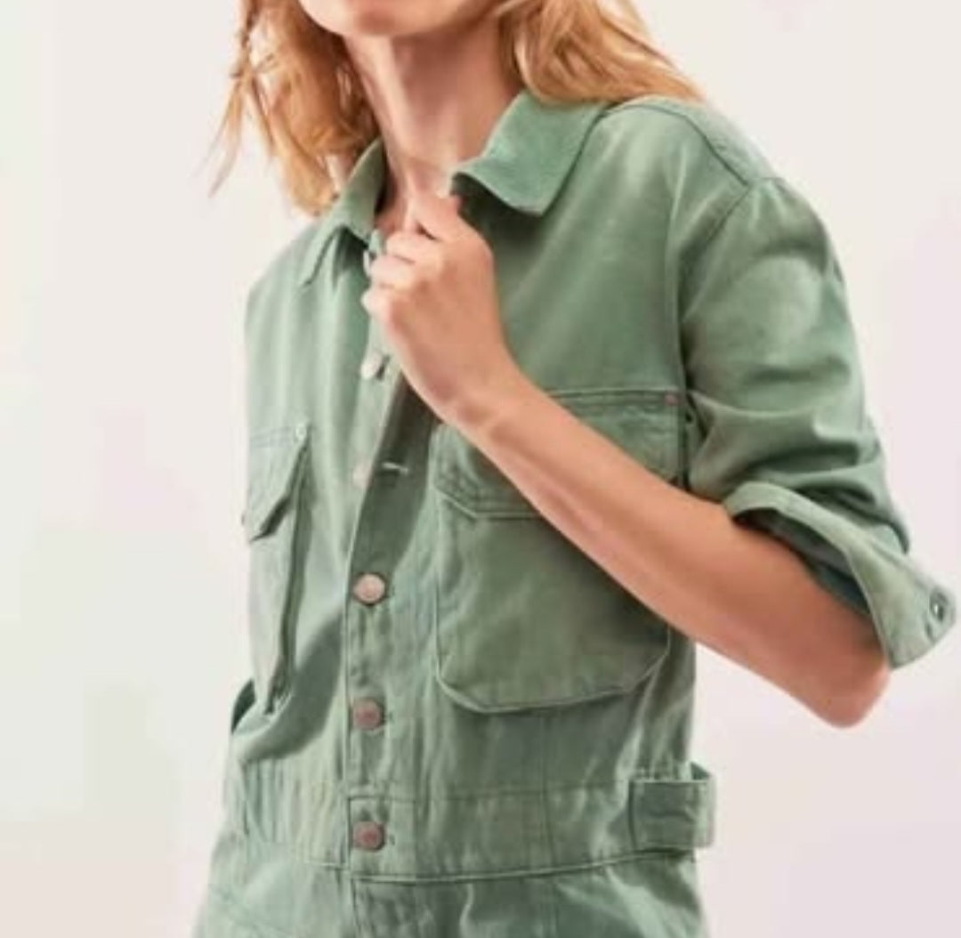 P-Free People Sandwashed Green Denim Jumpsuit Sz M
