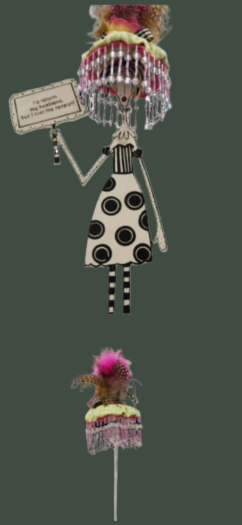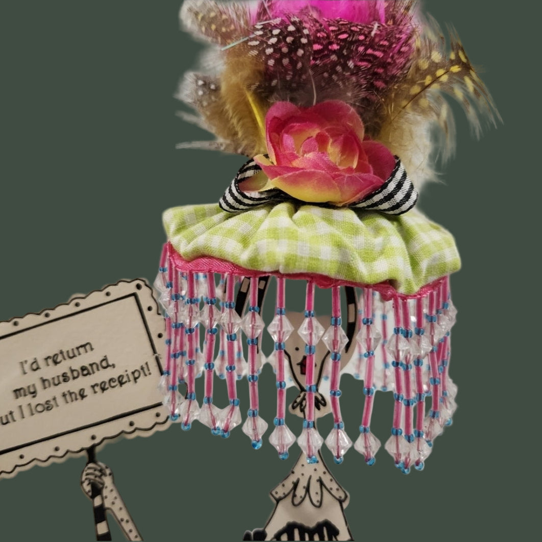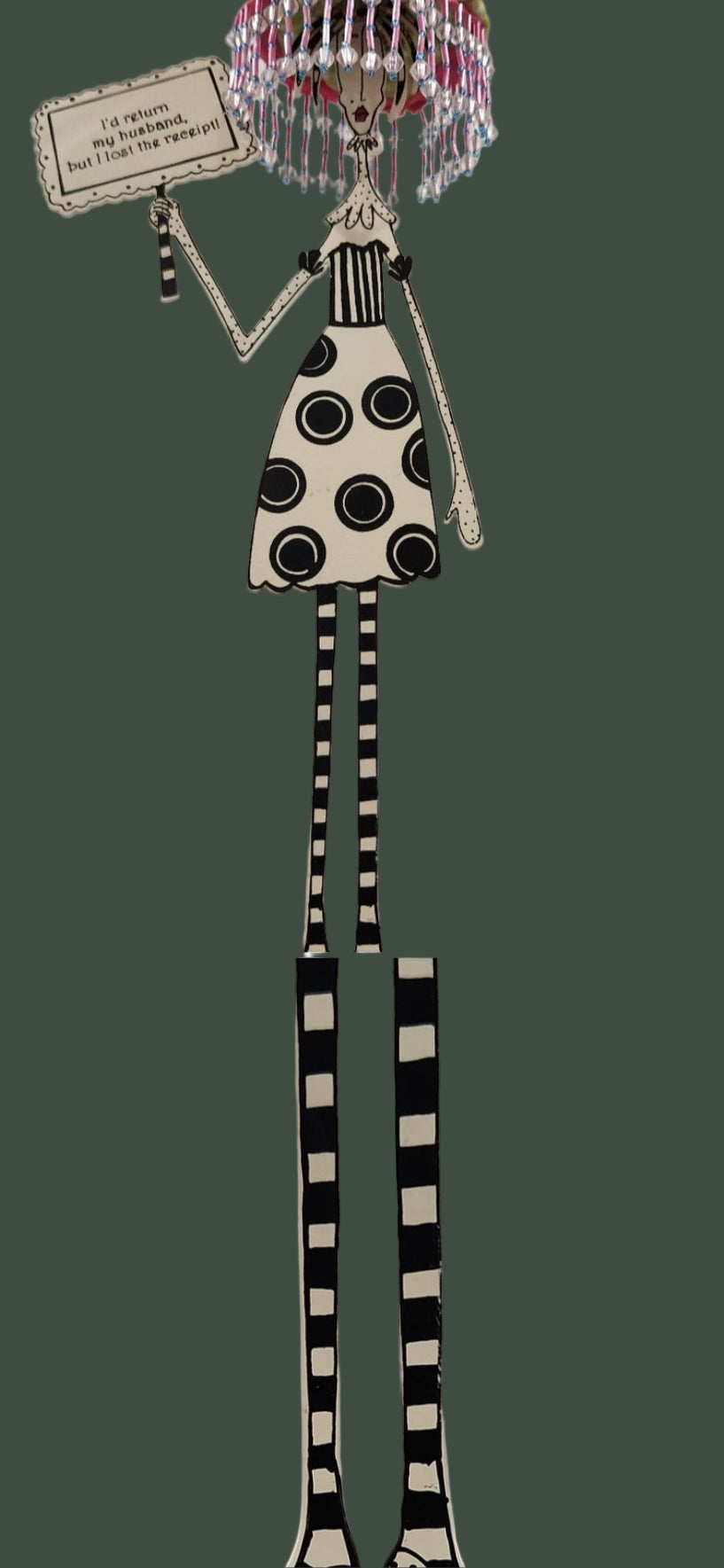 The Silvestri Comical Table Display, showcasing the 2005 edition design "I would return my husband but I lost my receipt," brings a clever and entertaining element to any setting. Skillfully designed, this display merges humor with practicality, serving as an excellent conversation piece while efficiently presenting your products.
