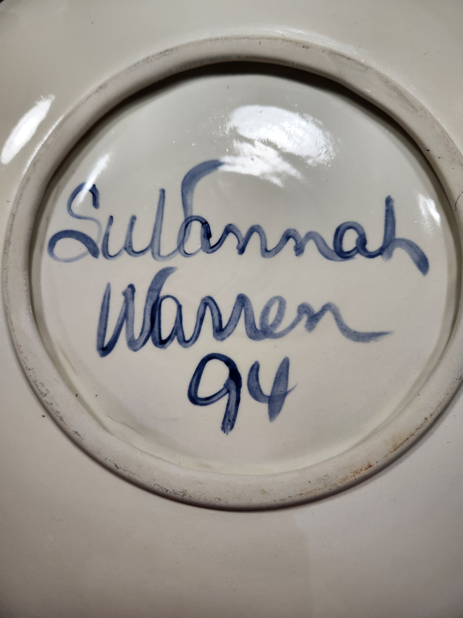 This platter is hand-made and very unique. I have searched and found some similar, but none exactly like it. It was made by artist SuVAnnah Warren in 1994. It is signed on both sides by the artist. Each fruit, vegetable or the lobster is individually made and fired onto the platter. The cabbage leaves function as a dip bowl. The platter measures 17" round.